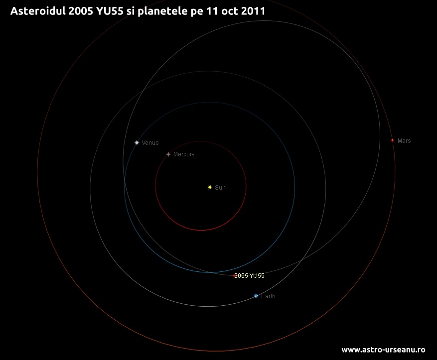Două frumoase știri ne anunță că un asteroid va trece foarte aproape de planeta noastră în luna noiembrie. Îl cheamă 2005 YU55, are aproximativ 400 m în diametru (dar probabil nu este rotund) și va trece la numai 320.000 de km de noi pe 8 noiembrie 2011.