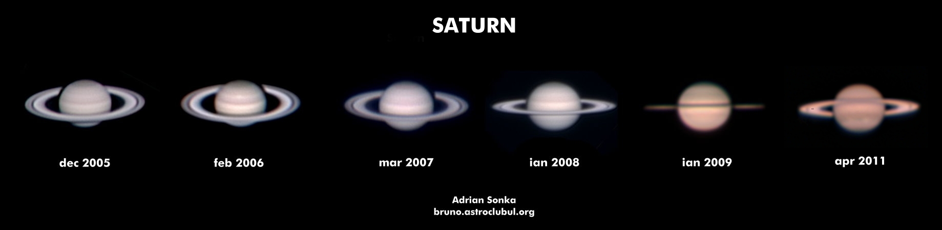 Mai jos găsiți imagini făcute de la Observator, prin două instrumente astronomice, cu diferite camere web, în ultimii șase ani. Se vede ușor cât de diferită apare planeta și că în 2009 inelele aproape că nu s-au văzut. Acum încep să se „deschidă” și se vor vedea din ce în ce mai bine.