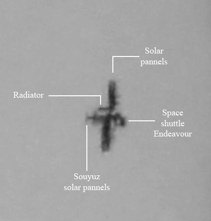 Prima fotografie a fost realizată de Max Teodorescu din vecinătatea Bucureștiului. A folosit o lunetă SkyWatcher ED 80 și un aparat foto DSLR. A luat expuneri de 1/2500 secunde la ISO 400, montând în fața obiectivului un filtru solar. Fotografiile ne arată detalii ale uriașului satelit și în plus, Naveta Spațială Endeavour, andocată alaltăieri.