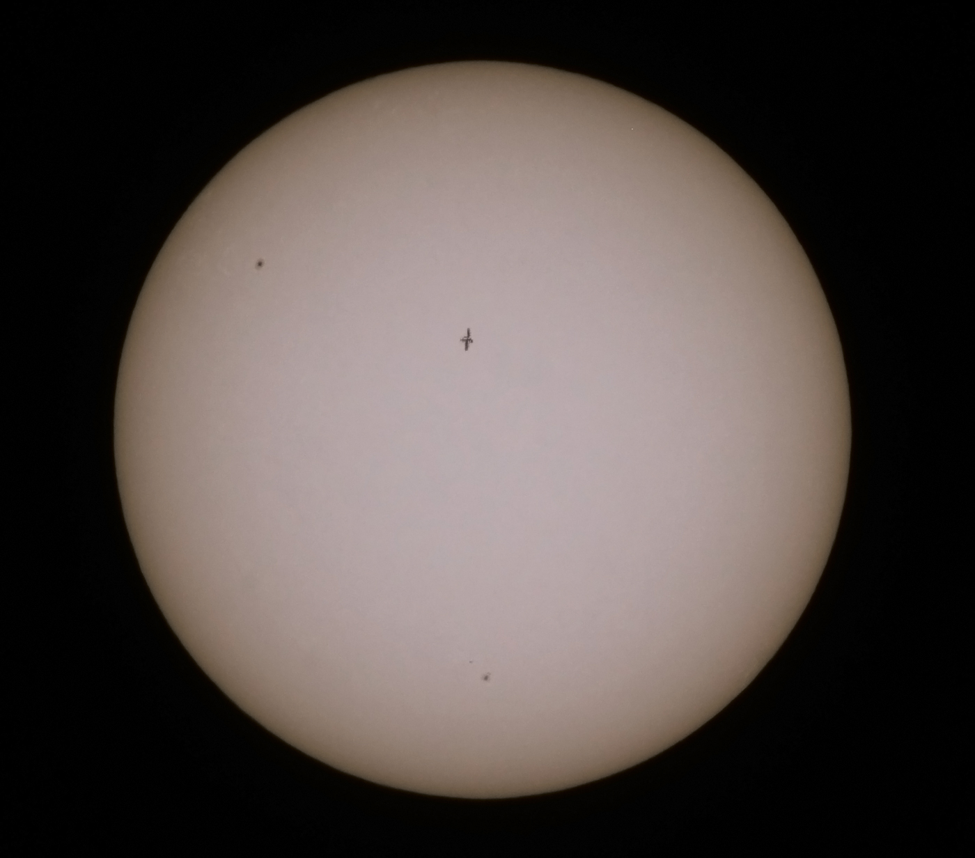 Uneori cel mai mare satelit artificial, singurul cu oameni la bord, se poate vedea ziua când trece peste discul Soarelui.