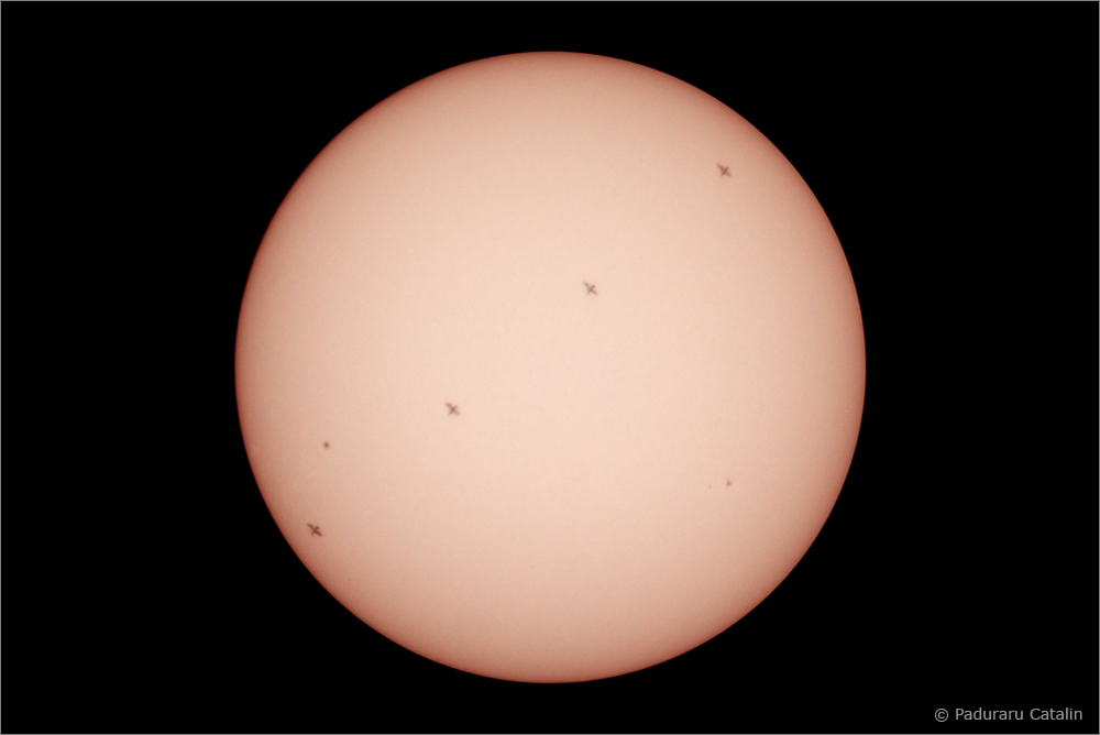 Cătălin a folosit o lunetă Vixen VMC 110L și un aparat foto Canon 50D și a reușit să surprindă patru imagini cu Stația Spațială peste Soare.