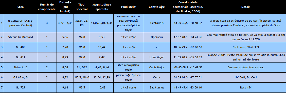 În sfera noastră există șapte sisteme stelare (fără Soare) care conțin 11 stele. Cea mai apropiată stea de noi este Proxima Centauri, o stea din sistemul α Centauri AB. De fapt Proxima se roteșe în jurul unui sistem binar. Astfel cea mai apropiată stea de noi face parte dintr-un sistem triplu și mai mult: una din stele este asemănătoare cu Soarele!