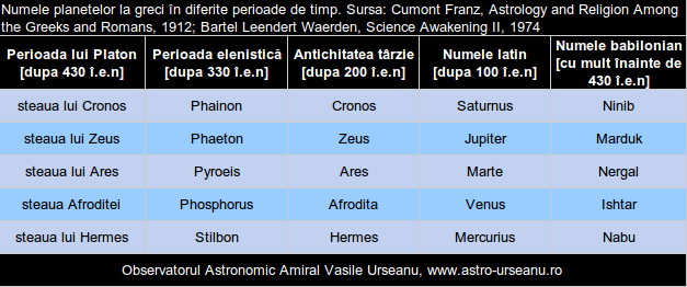 Cel mai vechi nume de planetă menționat este „Esophoros”, steaua serii. Se referă la Venus și apare în opera lui Homer. După anul 430 î.e.n se folosesc următoarele nume pentru cele cinci planete (în afară de Soare și Lună): steaua lui Kronos, steaua lui Zeus, steaua lui Ares, steaua Afroditei, steaua lui Hermes. Platon le folosește în Epinomis, punându-le pe seama „barbarilor” din Egipt și Siria care au făcut observații astronomice. Acest lucru însemnă că grecii au schimbat numele babiloniene ale planetelor, „metodă” folosită și de romani. În amandouă cazurile o civilizație a schimbat numele zeităților „barbare” cu cele ale zeităților acutale.