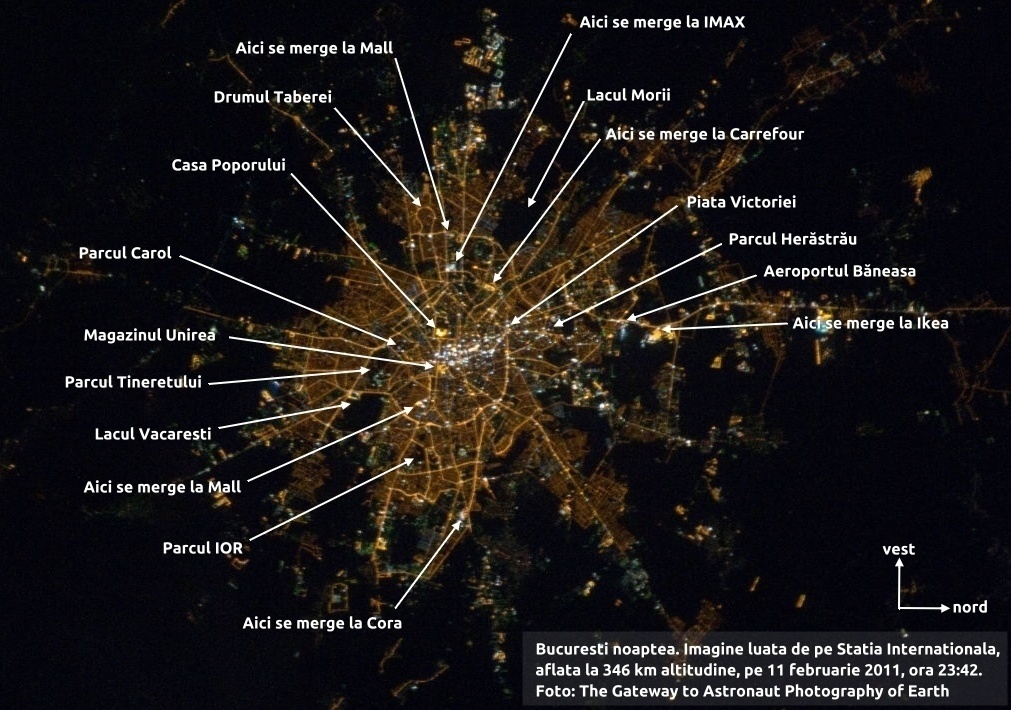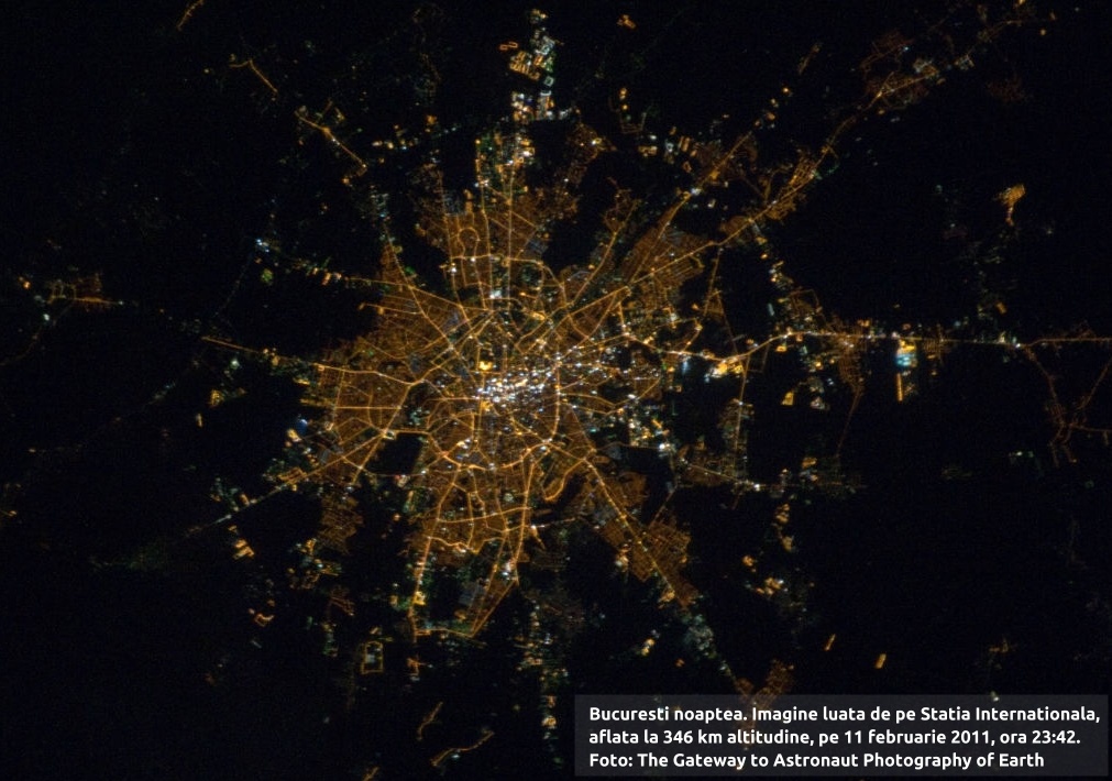 Nu spun că astronauții chiar le-au văzut, dar câteva locuri din București emit mai multă lumină în spațiu decât altele. Se pot vedea arterele principale pe care le poți învăța mai bine decât pe o hartă normală. Parcurile încă mai sunt oaze de întuneric, mai puțin Herăstrău.