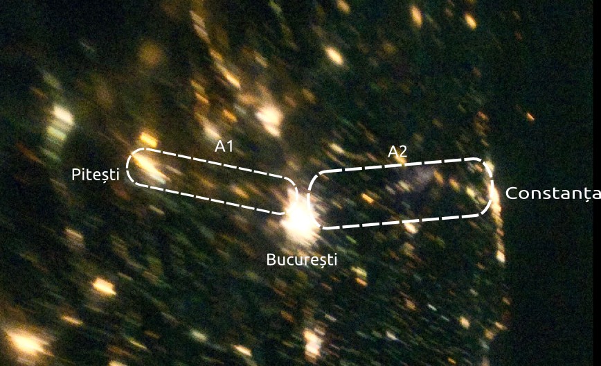 Pe o imagine de noapte luminile orașelor trădează mărimea lor sau geografia locului, stațiunile de pe Valea Prahovei și localitățile care punctează cele două autostrăzi (A1 și A2) fiind evidente în fotografie. La fel și litoralul românesc, ce începe de la Năvodari și se termină la Vama Veche, exact după o cum arată și luminile.
