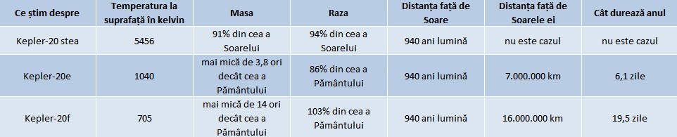 Mai știm în cât timp se rotesc în jurul stelei lor (cât dureză un an): 6,1 zile pe Kepler-20e și 19,6 zile pe Kepler-20f. Vestea bună ar fi că revelionul ar veni foarte repede. Cea proastă că planetele sunt atât de aproape de stea încât temperatura la suprafață ar depăși 400° C.