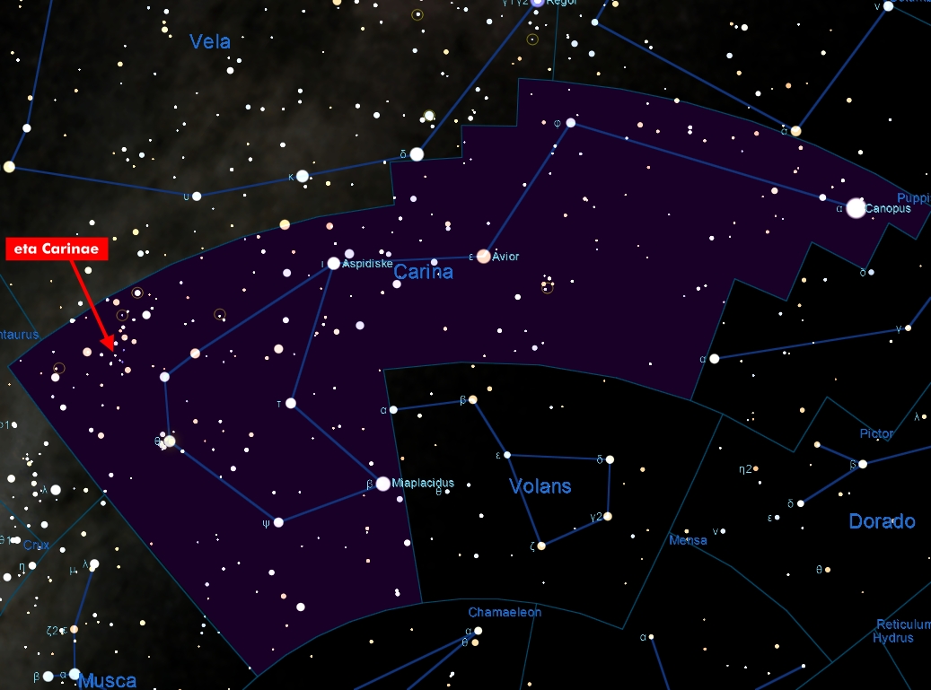 Una dintre cele mai mari stele cunoscute este eta Carinae (eta din constelația Carina), stea care (din păcate) nu se poate vedea din emisfera nordică. Se află la  aproximativ 7500 ani lumină depărtare și are masa de 100 de ori mai mare decât a Soarelui.