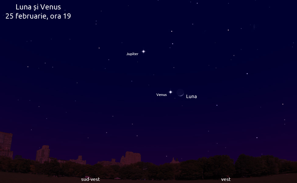 Ieși afară în seara de 25 februarie, privește înspre vest, și vei vedea Luna lângă planeta Venus. Mai sus se află Jupiter.