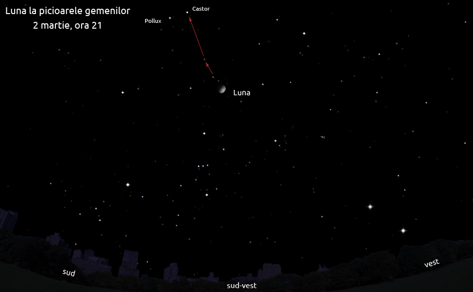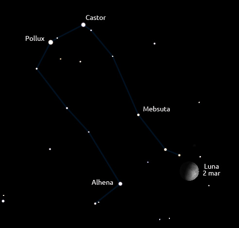 Ieși afară în seara de 2 martie și caută Luna. O vei găsi la picioarele gemenilor. În stânga sus se află două stele relativ asemănătoare ca strălucire: sunt Castor (dreapta) și Pollux (stânga) din constelația Gemini.