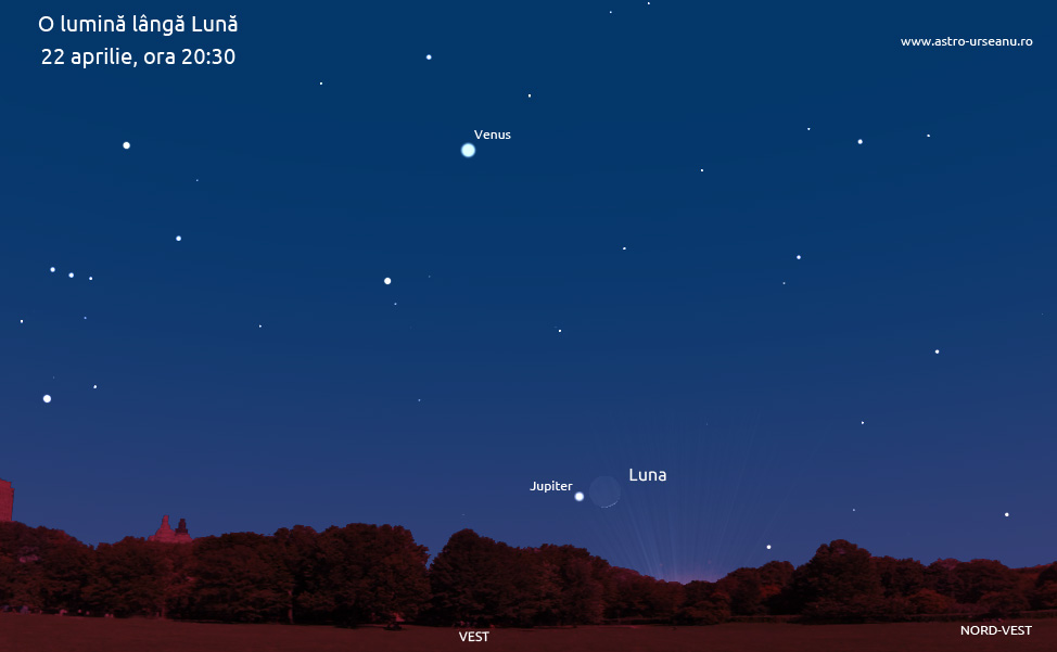 Caută Luna în seara de 22 aprilie, până în ora 21, și vei vedea chiar lângă ea o stea strălucitoare. Este planeta Jupiter care în curând se va prierde în razele Soarelui.
