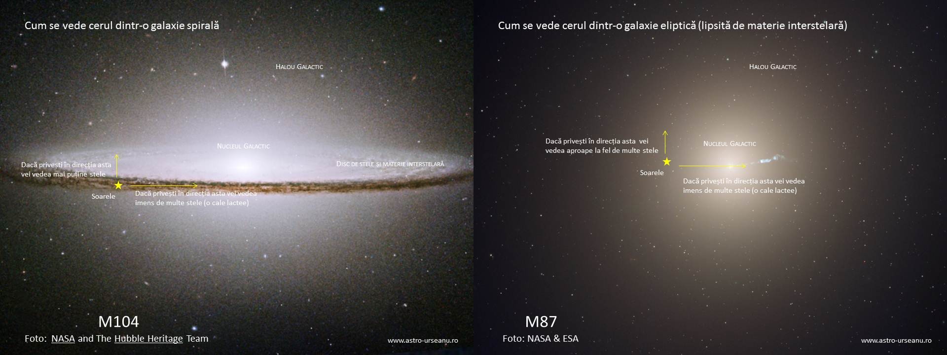 Există și galaxii care nu au formă de spirală ci sunt simple aglomerări sferice de sute de miliarde de stele. Dacă ne-am afla într-o asemenea galaxie, tot cerul ar fi o cale lactee fără nori de gaze și praf.