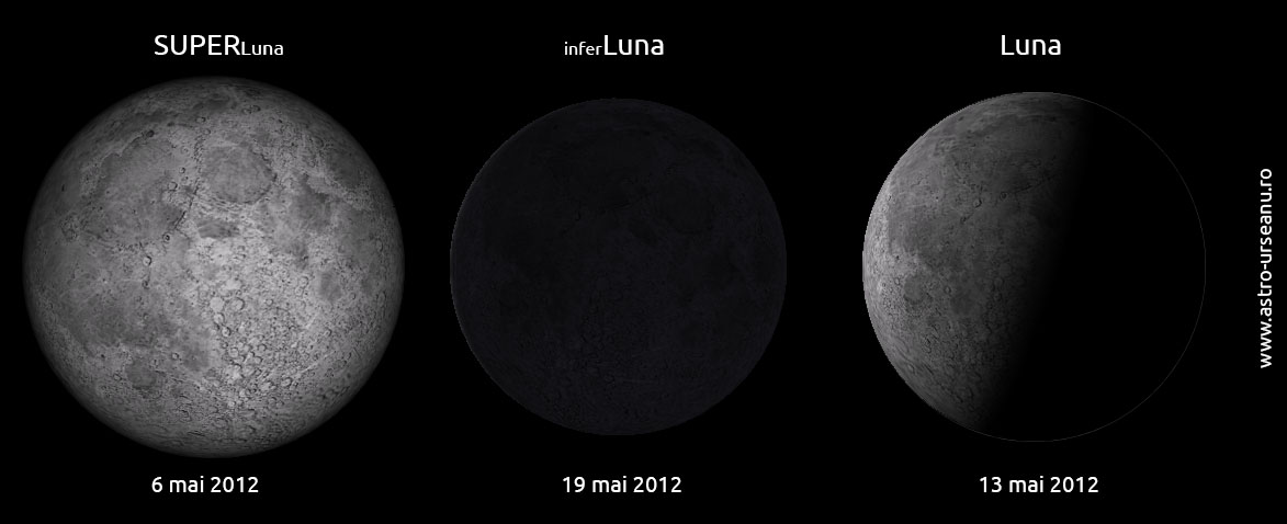 SUPERLuna s-a produs pe 6 mai când s-a aflat la 356.953 km depărtare. inferLuna se produce pe 19 mai când Luna se va afla la 406.450 km depărtare și va fi în faza de Lună Nouă.