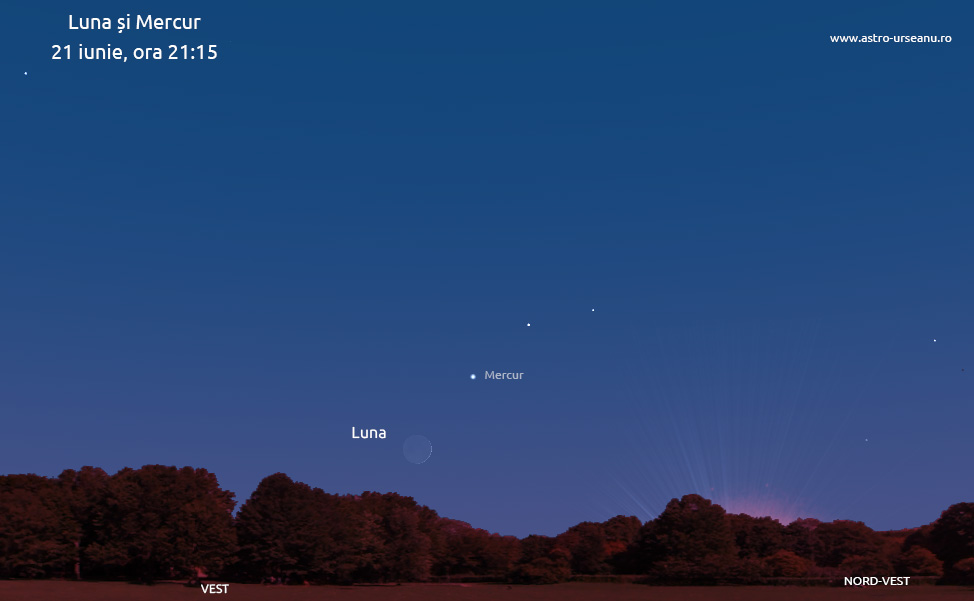 Privește Luna în seară zilei de 21 iunie (în jurul orei 21:15) și vei vedea în dreapta sus o planetă greu de observat: Mercur