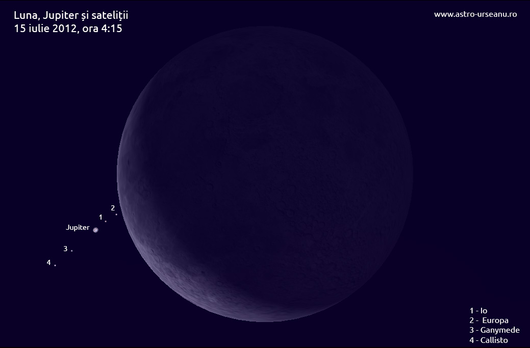 Simplu. Trebuie să ieși afară în dimineața de 15 iulie , în jurul orei 4, dar nu mai târziu de 4:15. Trebuie să cauți Luna, care se va afla aproximativ înspre est. Vei vedea imediat că lângă marginea din stânga a acesteia se va afla un astru strălucitor, planeta Jupiter. La sud de Lună se va afla Venus, care nu trebuie confundată cu Jupiter (planetă care se află „lipită” de Lună la acea oră).