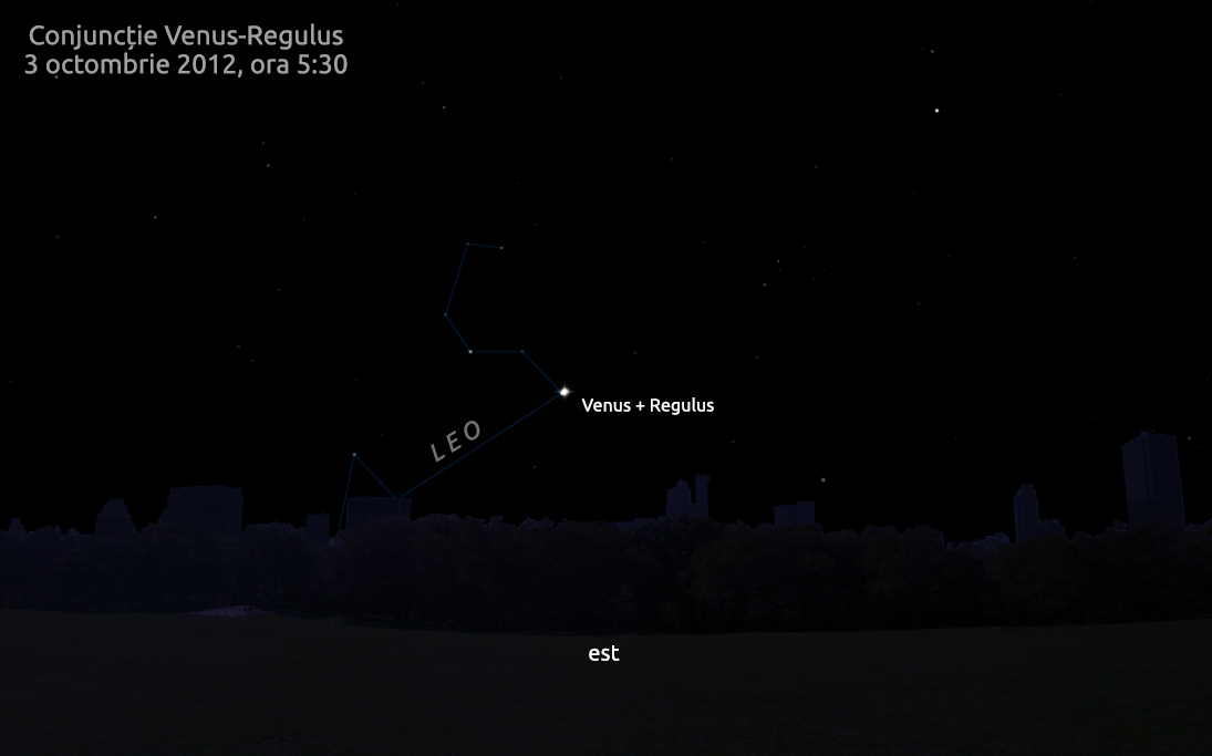 Ieși afară în dimineața de 3 octombrie, oricând între 3:45 și răsăritul Soarelui, și privește înspre est. Vei vedea un astru luminos, planeta Venus, și foarte aproape de el altul, steaua Regulus din Leo.