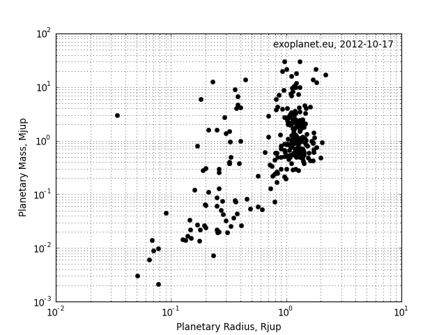 Raza planetelor în funcție de masa lor. Masa lui Jupiter = 317 mase terestre; raza lui Jupiter = 11 raze terestre: Grafic: exoplanets.eu