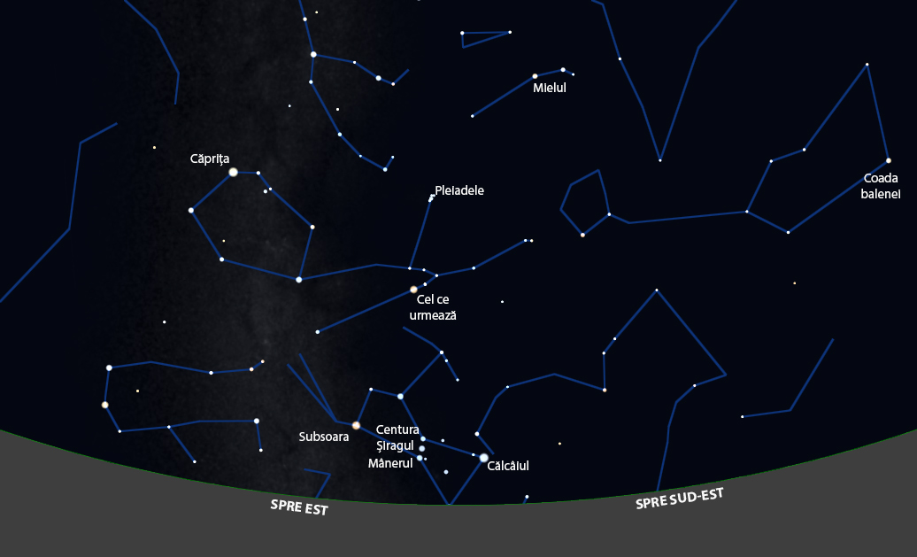 Să nu uităm de centura lui Orion, cele trei stele în linie, care se numesc (de la stânga la dreapta) mânerul, șiragul și centura. Sună a titlu de film. Mai lipsesc ardelenii…