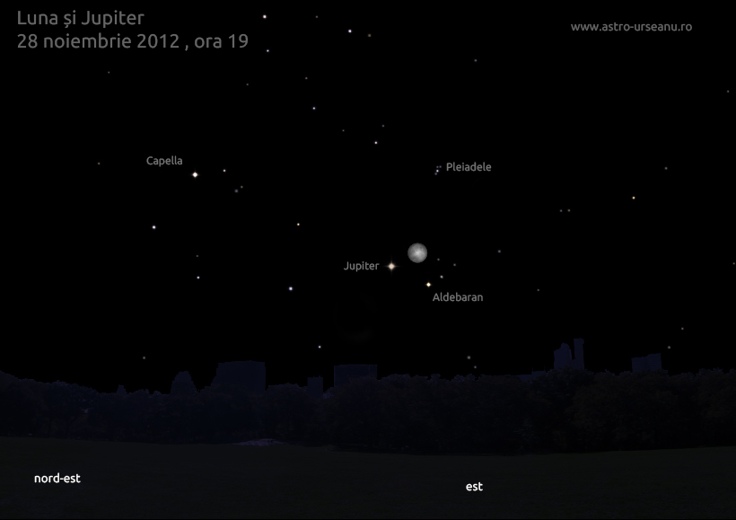 Ieși afară în seara de 28 noiembrie și privește înspre est. Vei vedea Luna într-o companie de zile mari: în stânga (și cel mai strălucitor astru) planeta Jupiter, în jos steaua Aldebaran și sus Pleiadele, toate din constelația Taurus.