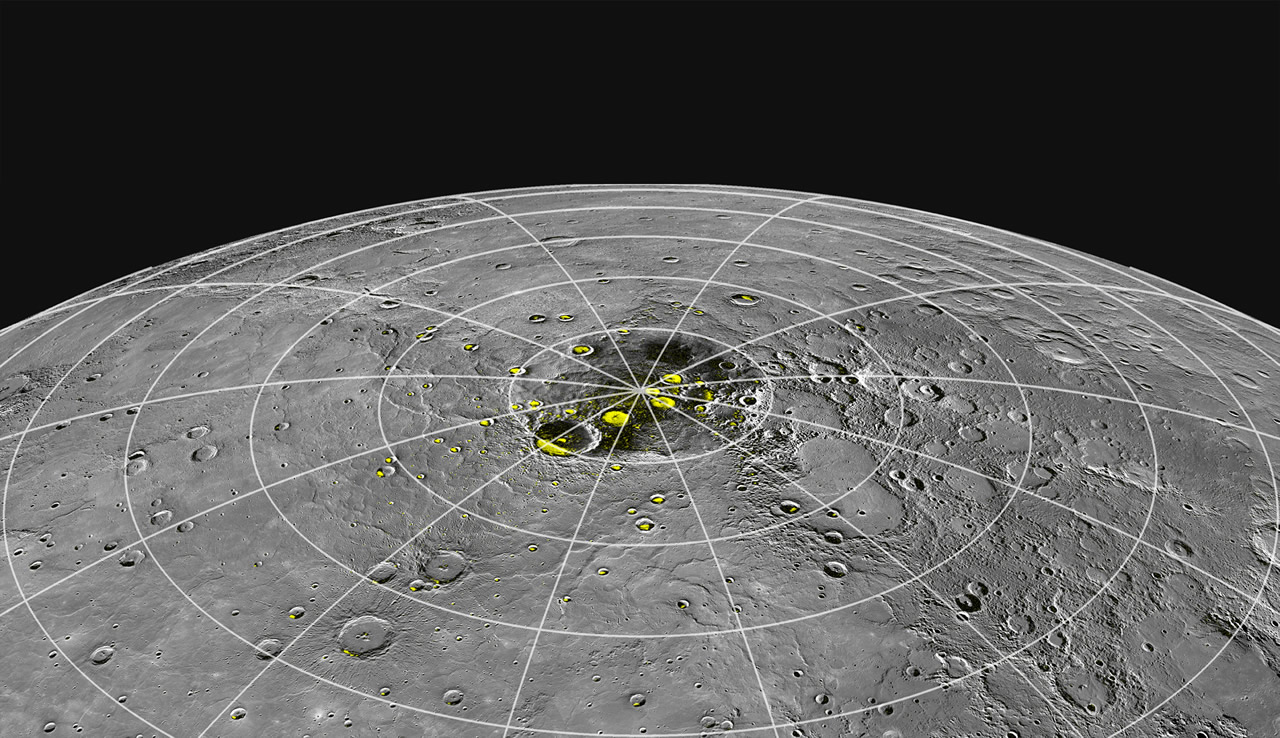 Pe acestă planetă gheața nu poate exista oriunde. Noaptea e frig dar ziua sunt peste 400° C și orice sloi de gheață s-ar topi/evapora imediat. Doar în unele locuri, acolo unde lumina Soarelui nu pătrunde niciodată, poți spera să găsești așa ceva și chiar asta s-a întâmplat.