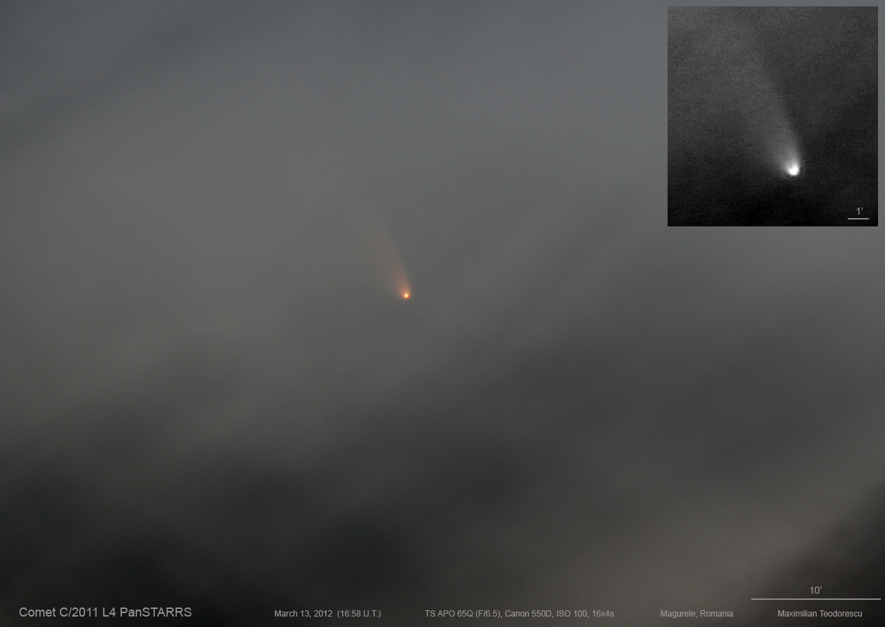 Cronologic, prima observație aparține lui Max Teodorescu, fotografia lui fiind datată 10 martie, ora 19:07. La acea oră cometa se afla la numai două grade deasupra orizontului, ceea ce este foarte puțin: privește înspre orizont, întinde mâna și privește cu un ochi unghia de la degetul mare. Aceasta ocupă două grade pe cer. Pune degetul la marginea orizontului și vei vedea cât de „jos” era cometa.