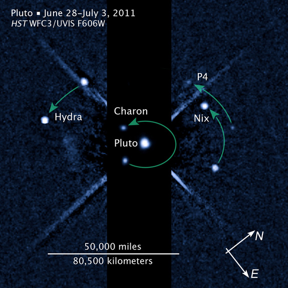 Putem vorbi încă din 2005 de un adevărat „sistem” la Pluto: avem două obiecte mari Pluto și Charon care se atrag reciproc, învârtindu-se în jurul centrului comun de masă. În afară lor există alte patru corpuri, două cu mărimea de aproximativ 100 de km și două mai mici de 10-20 km mărime. Cele patru corpuri mici se rotesc în jurul centrului comun de masă al sistemului Pluto-Charon și nu în jurul lui Pluto, cele două obiecte fiind considerate o planetă dublă.