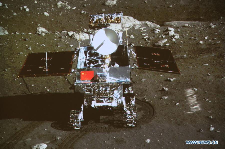 Vehiculul selenar teleghidat s-a îndepărtat de „nava mamă” și a luat o frumoasă fotografie. Vedem în imagine sonda spațială Chang’e 3, înțesată de camere, acoperită cu o folie care încearcă să păstreze temperaturi acceptabile înăuntru, unde se află detectorii și câteva instrumente mai sensibile.
