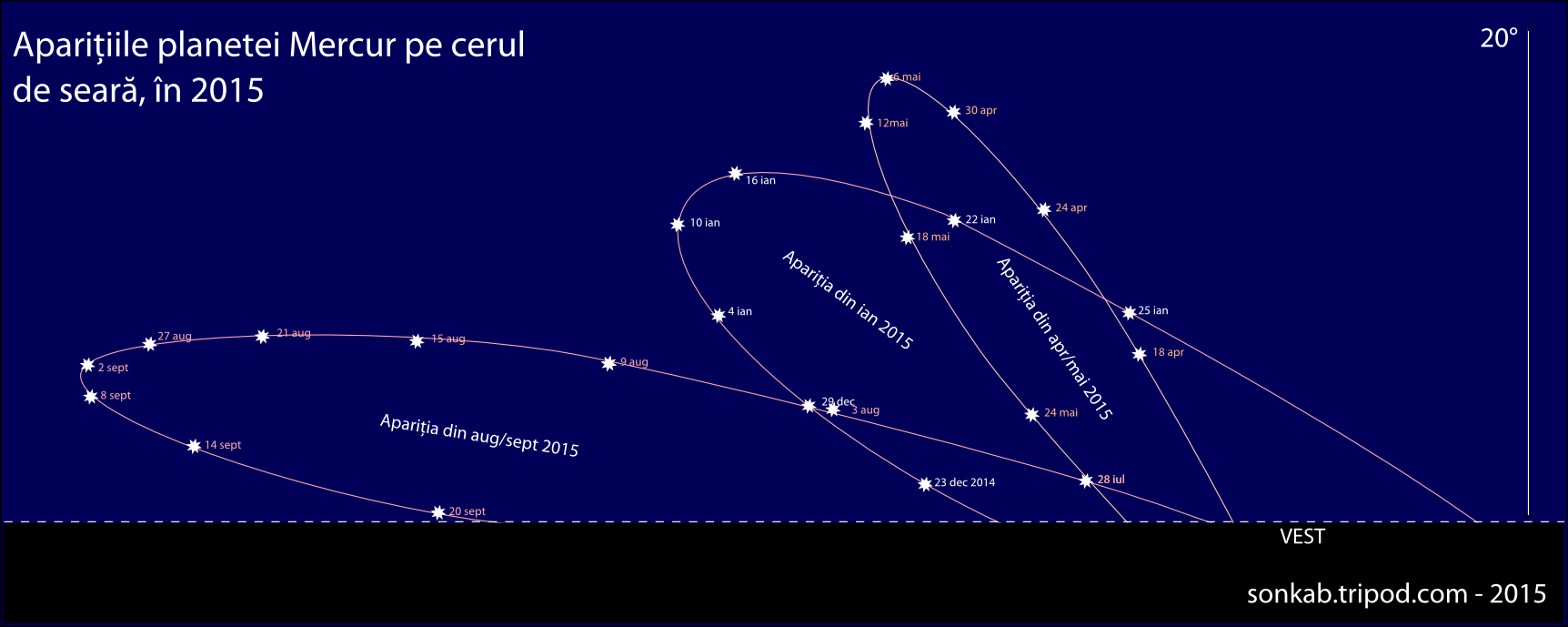 Din diagrama de mai sus veți realiza că apariția planetei Mercur din această lună este la fel de buna ca cea din aprilie-mai, când planeta se va afla cât de sus pe cer poate fi, după apusul Soarelui. Cu cât este mai mare înălțimea față de orizont, cu atât planeta se vede mai ușor.