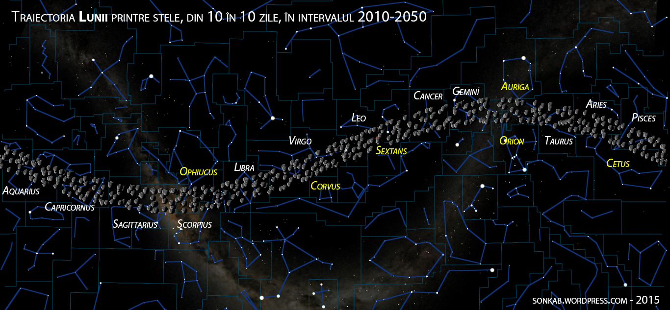 Și Luna, care se deplasează cel mai repede pe cer, străbate constelații în plus, nu mai puțin de șase alte forme închipuite pe cer.