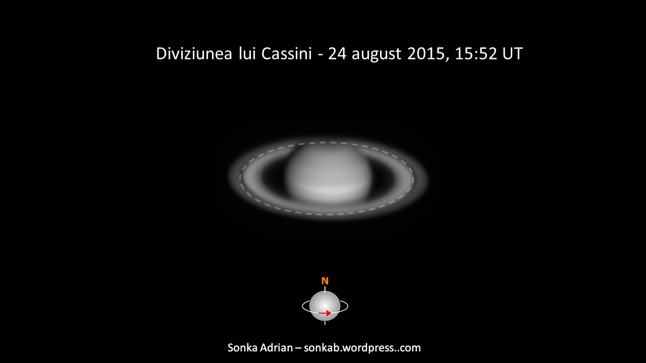 Priviți acum diviziunea lui Cassini, de jos, de la ora 0 pe ceas, mergeți spre stânga, în jos până ajungeți la partea situată peste disc (la ora 6). Vedeți cum la un moment dat, în regiunea aceea, diviziunea se întrerupe? Se întrerupe pentru că acolo, în spatele ei, se află discul planetei. Putem vedea discul prin diviziune! Chiar e gol acolo.