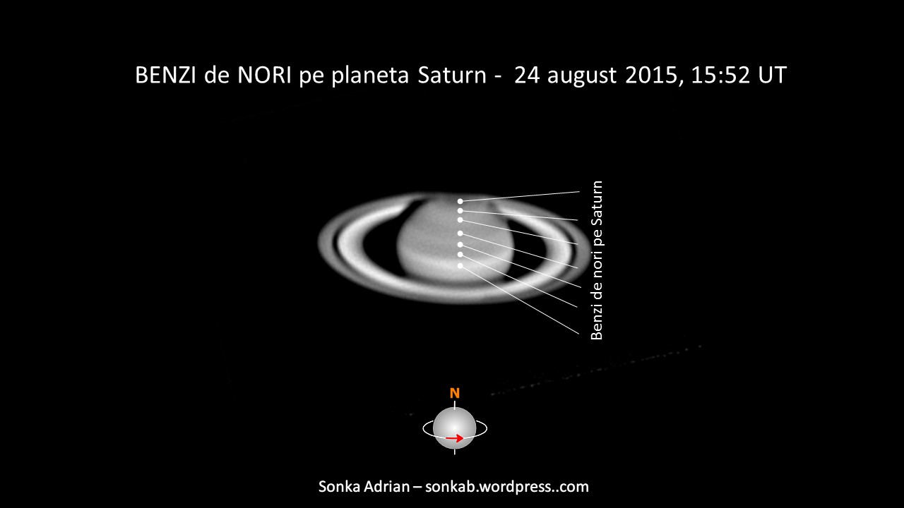 Imediat după hexagon urmează o bandă mai deschisă culoare, alta și mai deschisă, una mai închisă și îngustă, alta mai deschisă și îngustă și, în final, banda deschisă de la ecuator. Banda asta chiar așa se numește, „banda ecuatorială”, se observă mereu pe planetă dar se întâmplă ca acum să fie deosebit de îngustă și albă (adică reflectă bine lumina Soarelui). Am putea să continuăm cu enumerarea benzilor dar din păcate sunt ascunse de inel.