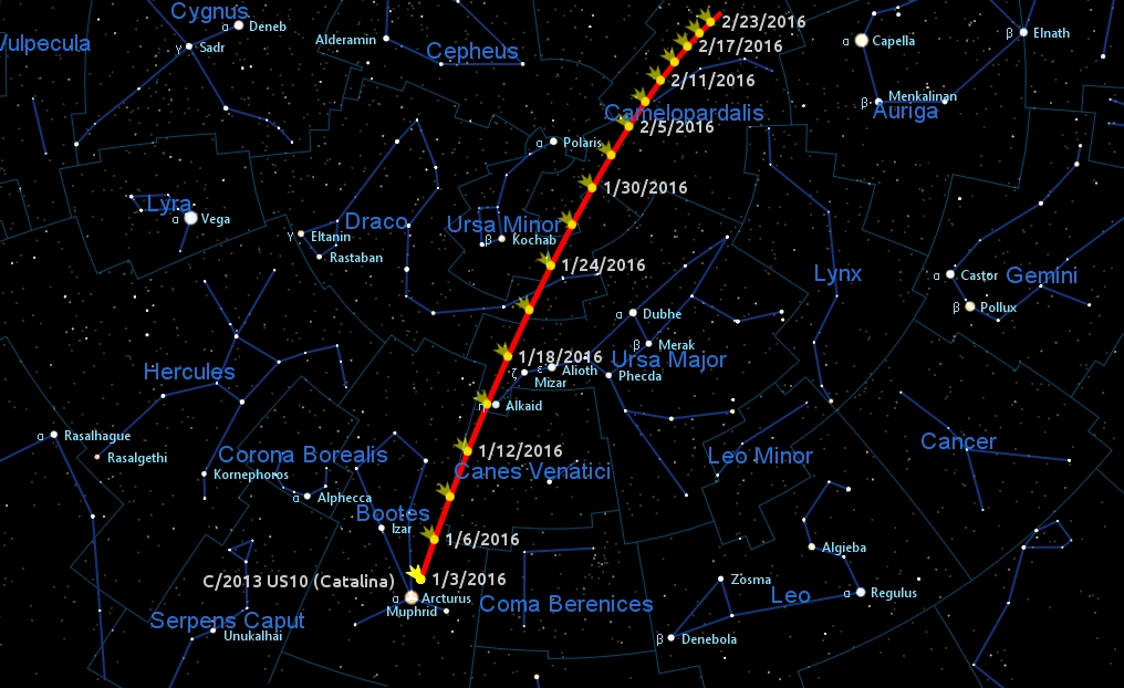Cometa Catalina rămâne pe cer, vizibilă în a doua parte a nopții, deplasându-se dinspre Bootes înspre Ursa Major. Nu se poate vedea cu ochiul liber, dar se vede prin binoclu sau telescop.