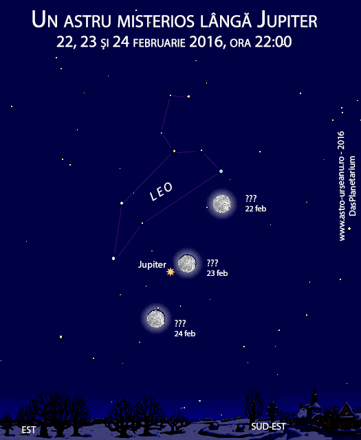 Însă mai mult ca sigur nu recunoașteți astrul de deasupra lui Jupiter (în seara de 22 februarie), de lângă planetă (în seara de 23 feb.) sau de dedesubt (în seara următoare). Sa-l privim cu atenție: este aproape rotund, foarte mare, plin de pete și se vede diferit de la o seară la alta.