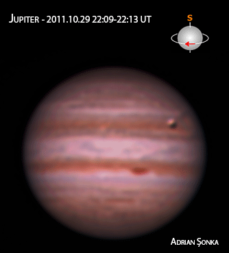 Din câte nu imi amintesc eu, seara de 3 octombrie 2011 a fost una banală pe Pământ. Pe Jupiter însă, văzut de la noi, se proiecta chiar pe Marea Pată Roșie umbra satelitului Europa (satelitul se vedea și el la marginea discului).