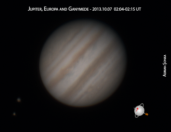 Anul 2013 vine cu o animație plină de detalii. Nu numai Jupiter se mișcă ci și doi dintre sateliții săi, Ganymede și Europa. Vi se pare că unul din sateliți este mai mare decât celălalt? Dacă da, vedeți bine. Satelitul mai mare este Ganymede, de aproape două ori mai mare decât cel alăturat, Europa.