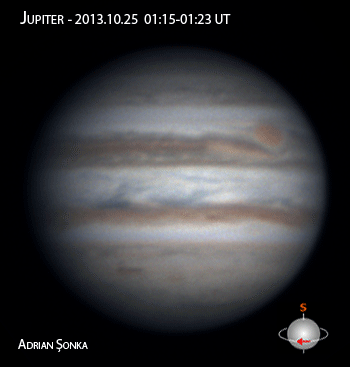 După câteva animații în care Pata Roșie s-a văzut doar într-o margine, acum începe aproape de centrul discului, dispărând sfioasă din cauza rotației. Avem aproape o oră de observații, timp în care planeta s-a rotit în proporție de 10%. Priviți acum în stânga sus față de pată, unde se află o altă pată roșie, chiar Red Jr.! Acesta s-a deplasat prin atmosferă ajungând acum la alte coordonate, dacă ar fi pe Pământ pe undeva în oceanul Pacific unde nu se află nicio insulă (165 grade longitudine vestică, 34 grade latitudine sudică).