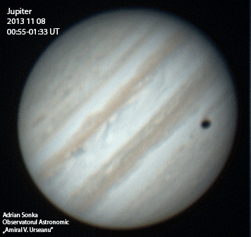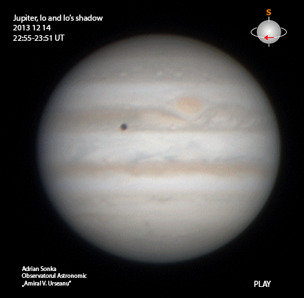 Multe se întâmplă în animația de mai sus, pentru că multe se întâmplă pe Jupiter: ochiul mare portocaliu este un anticiclon denumit „Marea Pată Roșie”; discul negru este umbra unui satelit care se vede și el la dreapta umbrei sub Pata Roșie; satelitul are două pete mai întunecate la poli sau, dacă vreți, o bandă ecuatorială albă, semn că este Io; deasupra petei roșii se văd patru+patru ovaluri albe, care sunt alte furtuni în atmosferă; tot Pata Roșie este urmată din dreapta de multe zone albe, turbulențe în atmosferă. Așa stau treburile pe Jupiter.