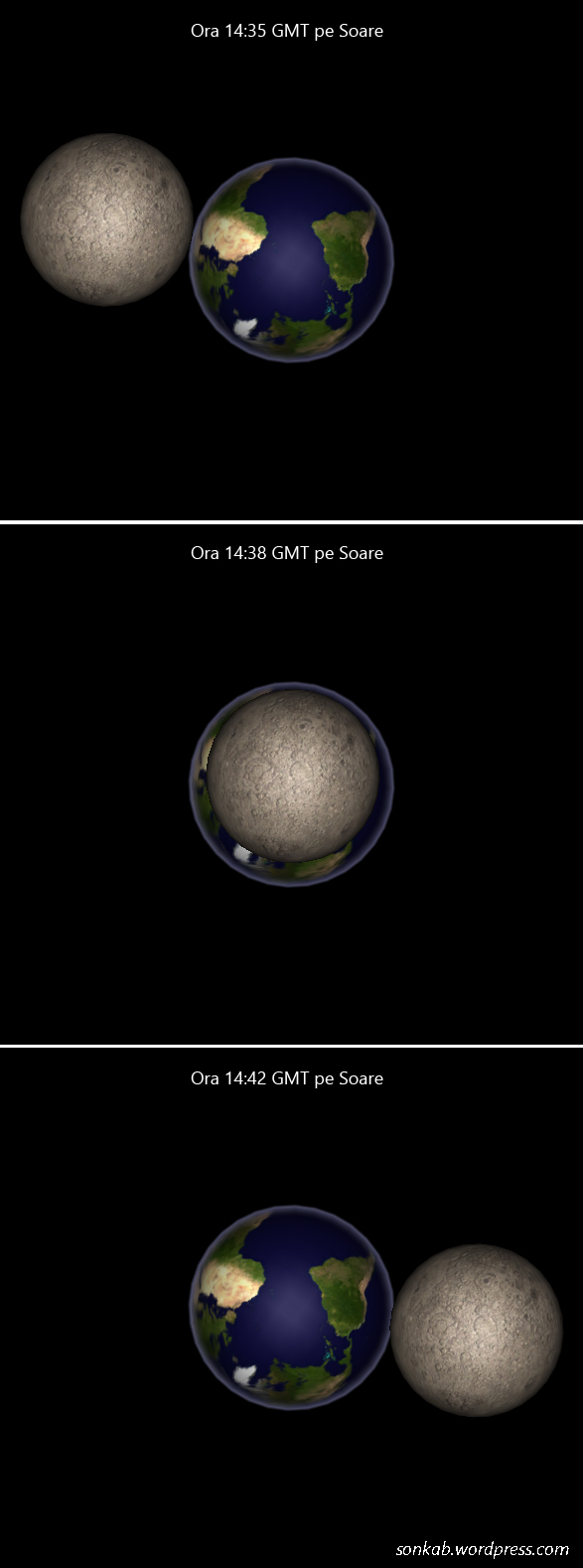 Fenomenul începe la ora 14:35 (GMT pe Soare) când cele marginile celor două discuri se ating. Maximul se atinge la 14:38, când discul lui Mercur se va afla peste cel al Pământului. Finalul acestui fenomen vine la 14:42, când iar cele două planete vor fi tangente. Un fenomen cu durata de numai șapte minute, dar șapte minute importante în viata unei stelei.