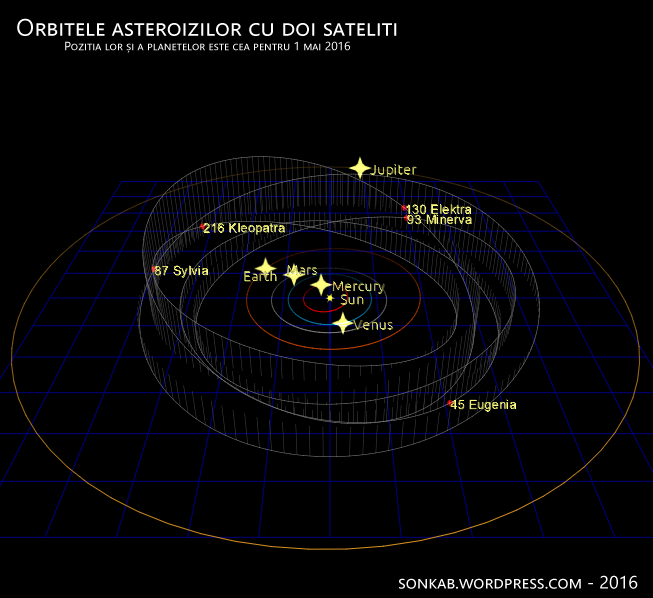 Elektra, asteroidul cu numărul 130, cu o mărime cam cât opt orașe București, a fost găsit în posesia a doi sateliți naturali. Sateliții sunt mici, cât un cartier (7 și 5 km) și se rotesc în jurul asteroidului în 5, respectiv o zi. Imaginați-vă un oraș de 200 km, plin de blocuri și grădinițe, însoțit în mișcarea lui prin spațiu de două cartiere care se rotesc în jurul lui. Cel mai mare dintre sateliți s-ar roti în jurul asteroidului de 336 de ori în timp ce acesta face o rotație în jurul Soarelui.