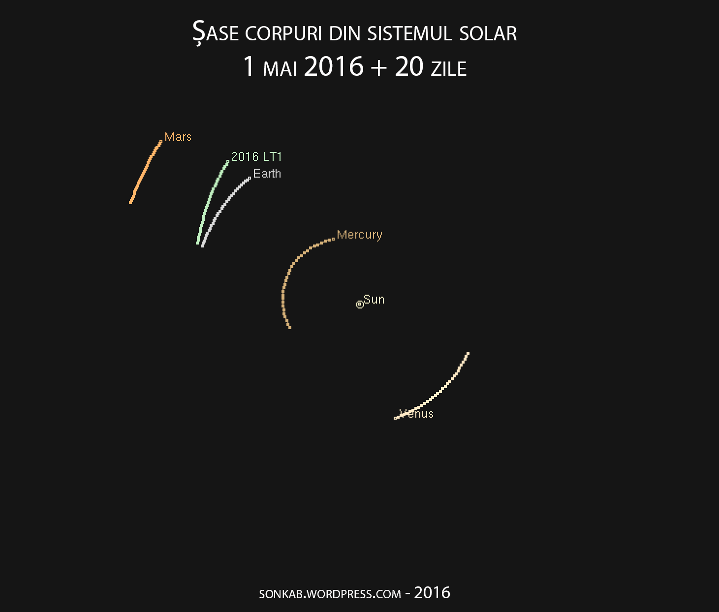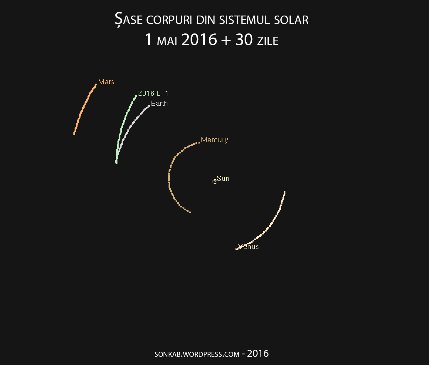 Cele șase corpuri sunt: Venus, Soarele, Mercur, Pământul, 2016 LT1 și Marte. Deja v-ați prins despre ce e vorba…