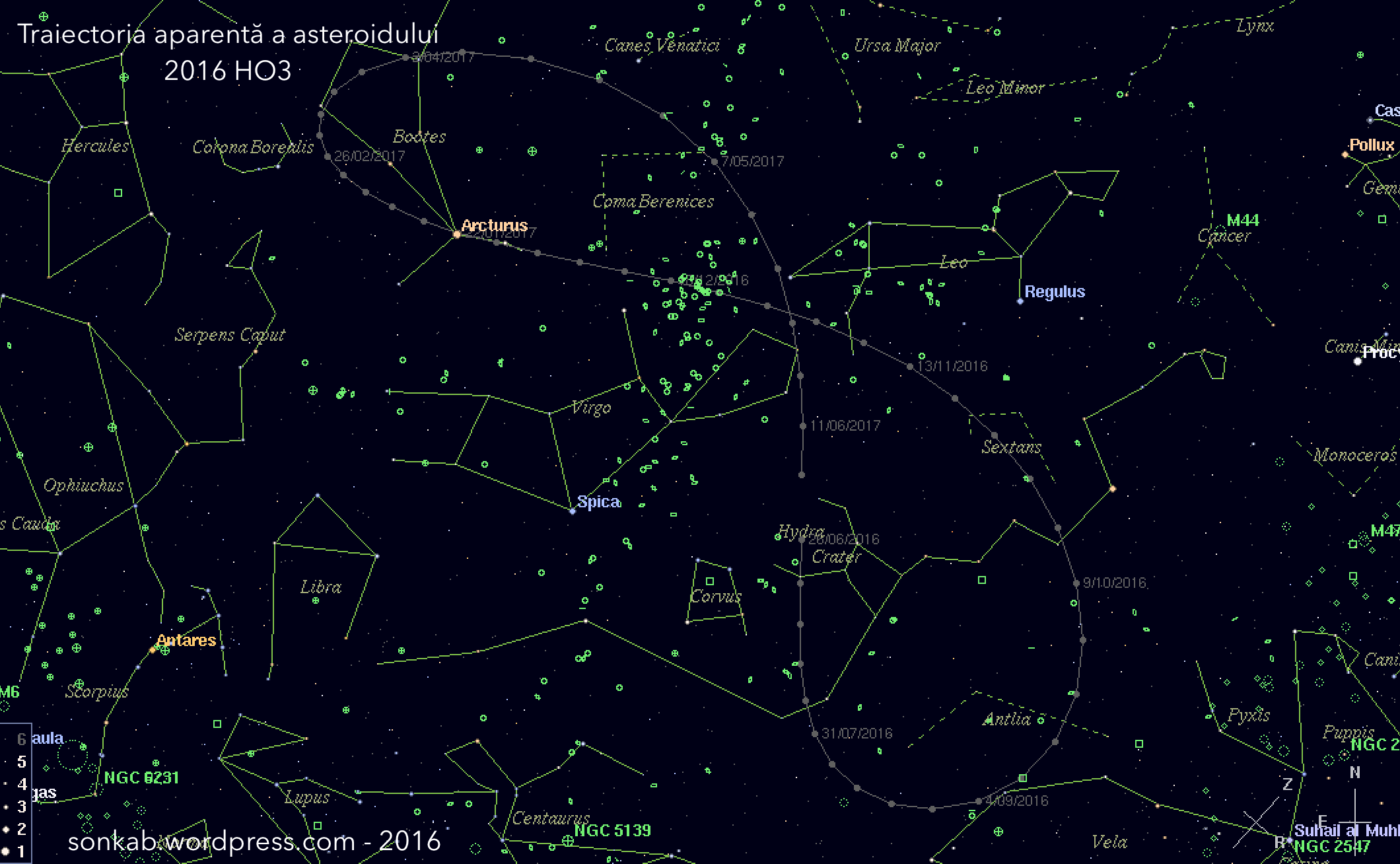 Chiar dacă nu are o strălucire aparentă mare (magnitudinea 22 cel mult), asteroidul merită urmărit. Priviți harta de mai jos, în care este tecută traiectoria din săptămână în săptămână, timp de un an. În următoarele luni se deplasează în emisfera sudică a cerului, dar revine la toamnă în constelații vizibile ușor din România. Va străbate în decembrie 2016 câmpurile bogate în galaxii din constelația Virgo, se va apropia aparent de Arcuturs, va urca în nordul constelației Bootes, după care coboară tot printre galaxii înspre Virgo, Hydra și Crater.
