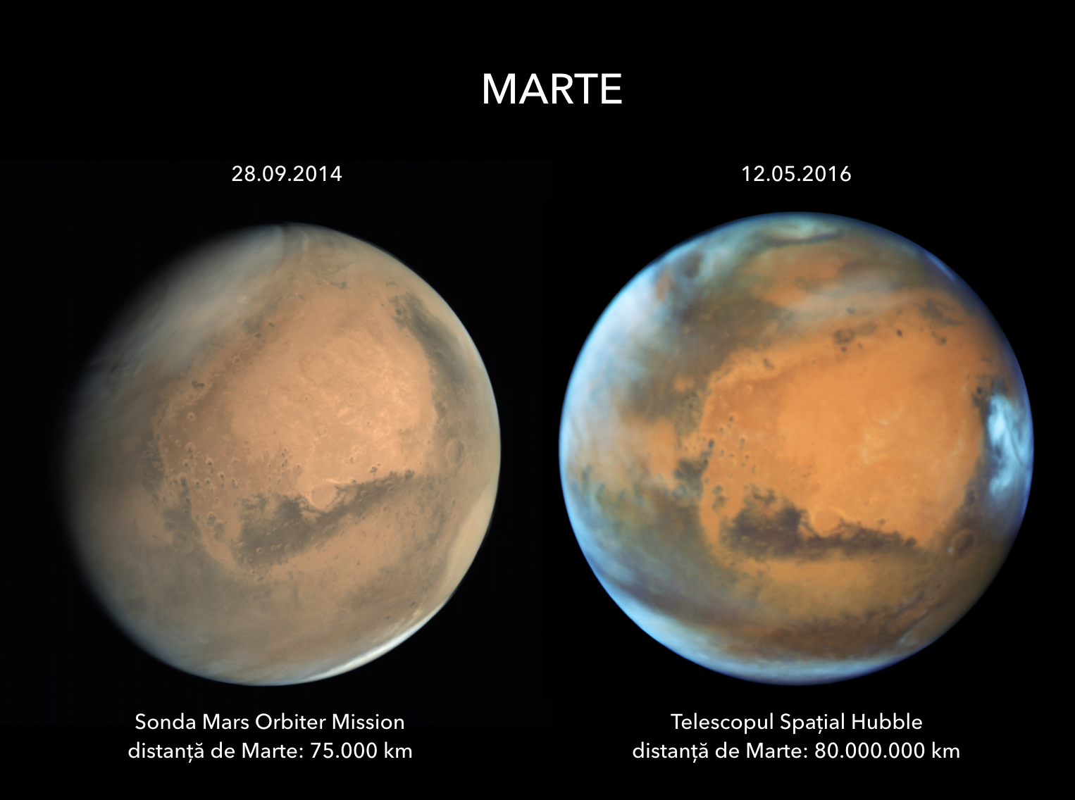 Iată o comparație între două imagini cu Marte, în care este surprinsă aceeași zonă a planetei.