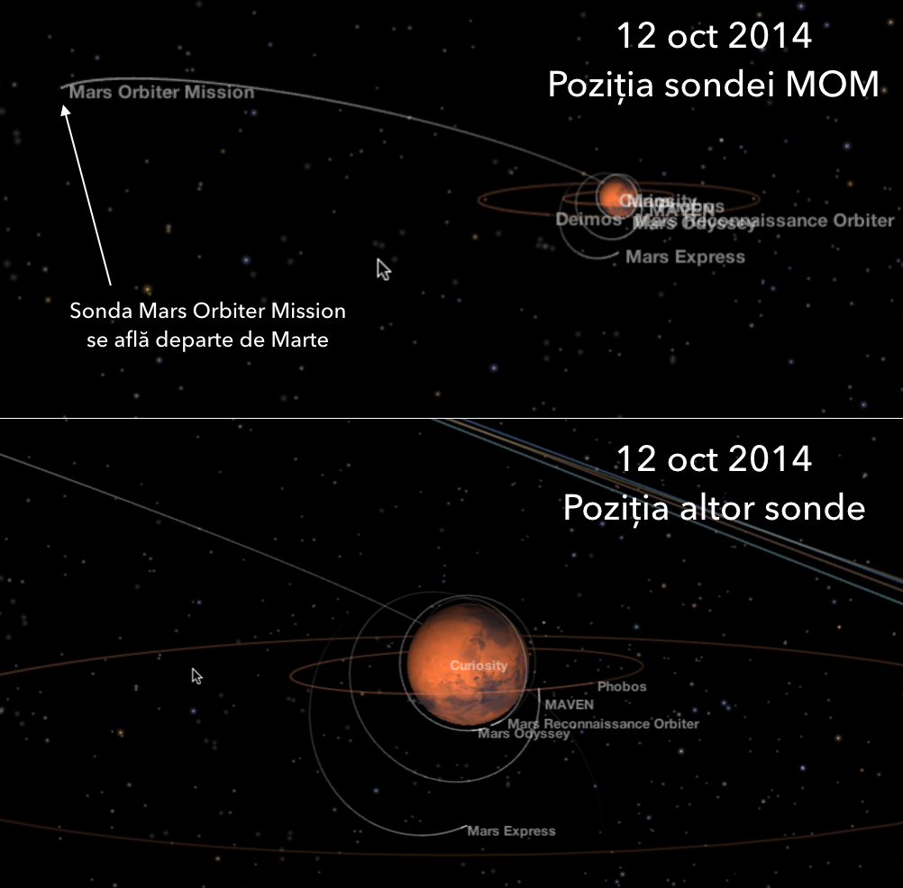 De ce poate sonda MOM să fotografieze toată planeta? Pentru că petrece departe de planetă o parte din revoluția în jurul lui Marte. Celelalte sonde marțiene nu pot fotografia decât zone mici, singurele portrete fiind luate în drum spre planetă. Iată mai jos o comparație a orbitei sondei MOM cu a celorlate sonde active în 2014.