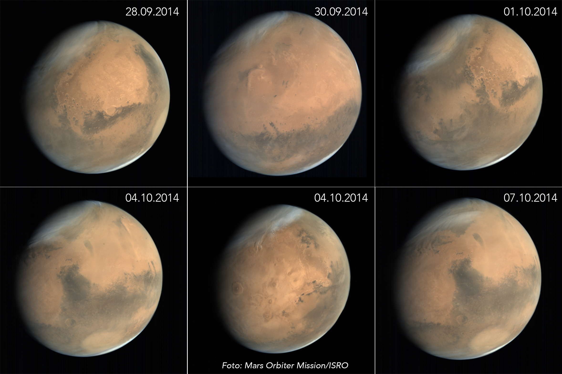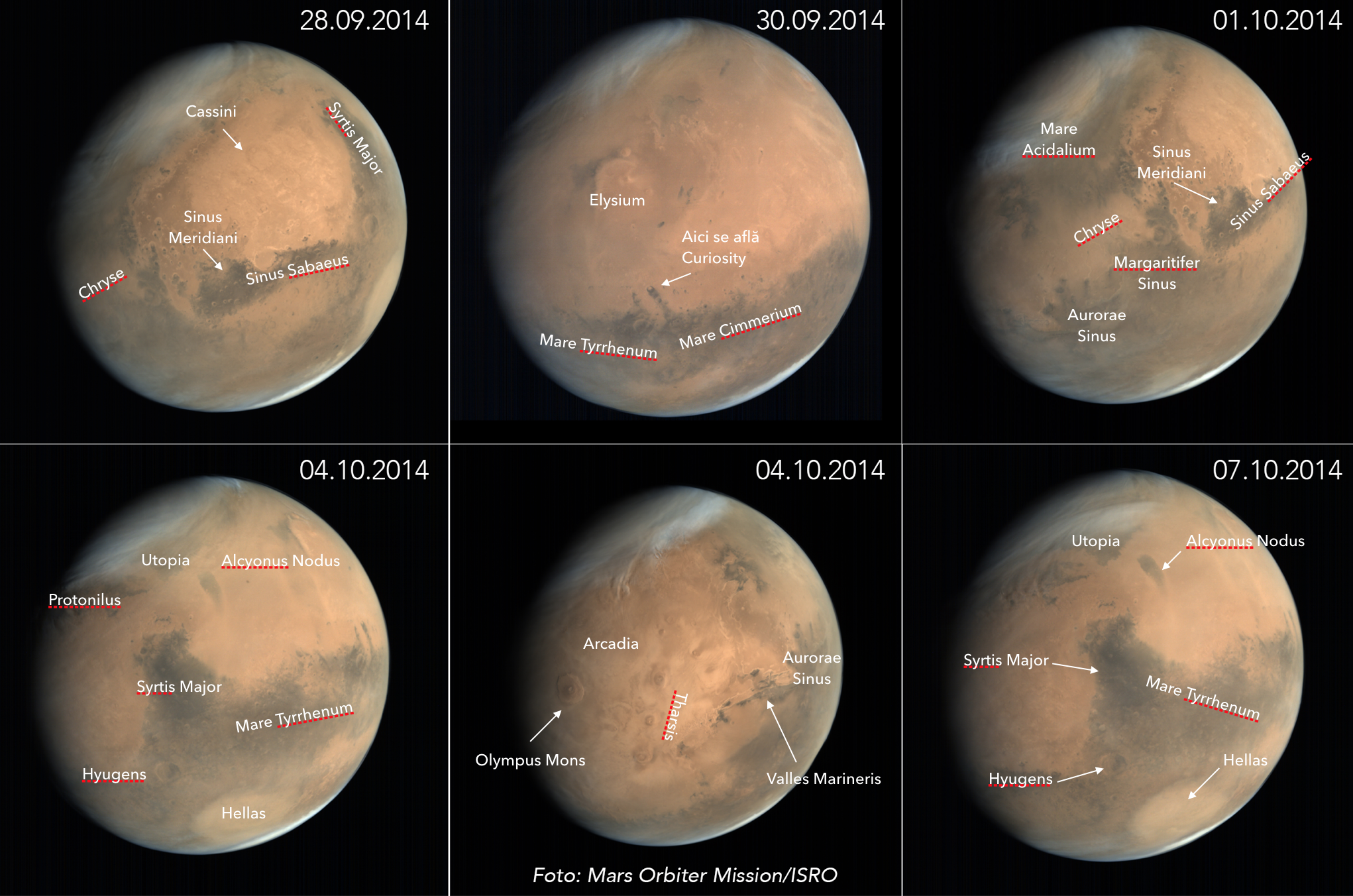 Iată că acum, Agenția Spațială Indiană (ISRO) a pus pe internet o serie de imagini luate la sfârșitul lui 2014. Imaginile sunt deosebite prin faptul că ne arată întregul disc al planetei Marte, la rezoluție bună a imaginii, ceea ce nu s-a făcut până acum cu altă sondă spațială.
