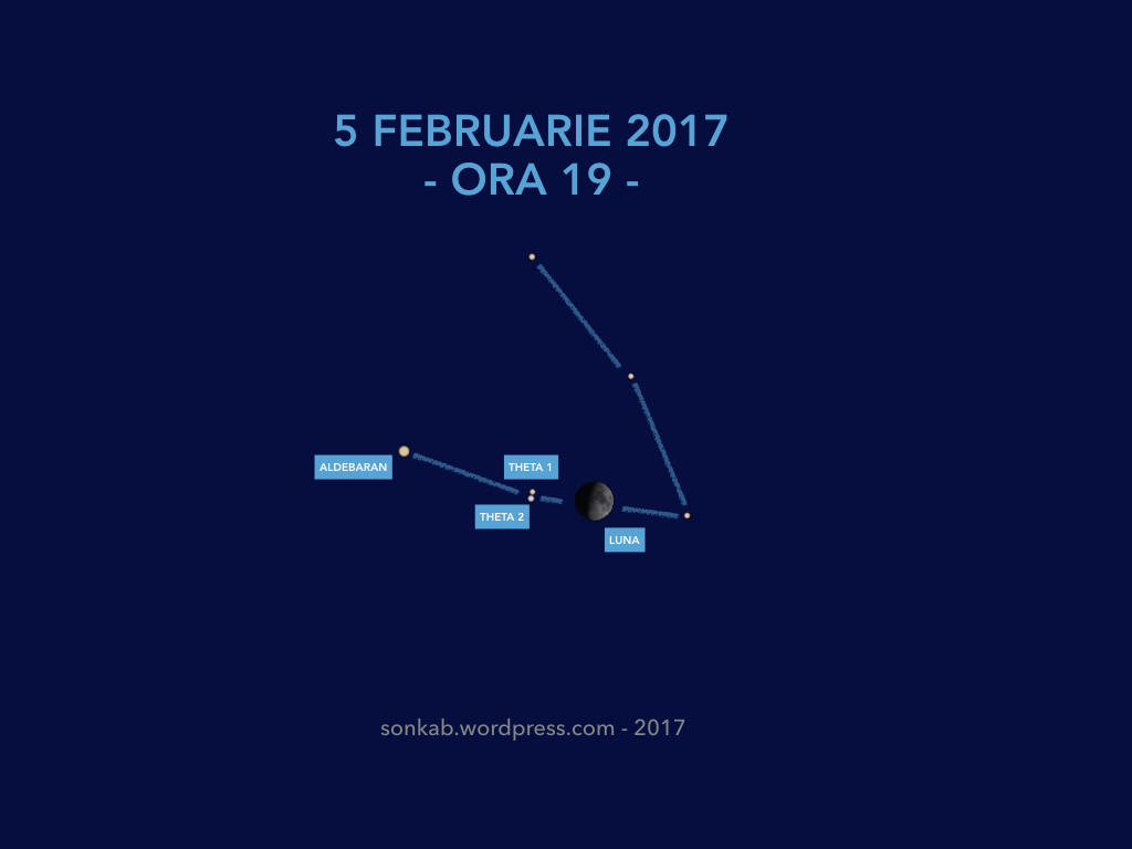 La ora 19:30-20 nimic nu pare că se va întâmpla, dar Luna nu stă nemișcată, ci străbate o zonă de cer egală cu diametru său în aproximativ o oră, de la dreapta la stânga. Dacă vă uitați bine, veți vedea că în stânga Lunii se află două stele aproapiate una de alta și Aldebaran mai departe (valabil între 19 și 20). Cele două stele apropiate se „numesc” theta 1 (sus) și theta 2 Tauri.