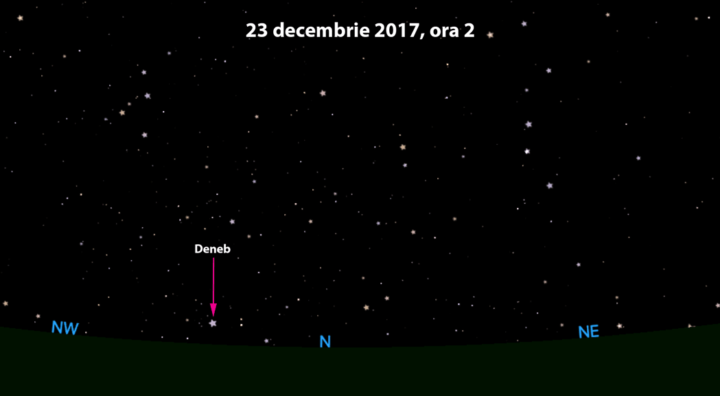 O altă stea de care nu scapi este Deneb. Acesta este enervană într-un mod cu totul diferit față de Vega. O vezi cel mai bine toată noaptea, sus pe cer, vara și toamna, dar iarna și primăvara nici măcar nu apune. În decembrie și ianuarie, aproximativ la miezul nopții se vede chiar înspre nord, la linia orizontului. Poți să aștepți să vezi cum se pregătește să apună, însă pregătește-te pentru o dezamăgire. Deneb se apropie razant de orizont dar nu apune, merge două ore paralel cu acesta, după care începe să „răsară”.