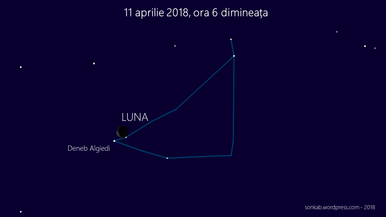 3. Caută Luna în dimineața de 11 aprilie, în jurul orei 6 dimineața. O găsești înspre răsărit sub formă de seceră foarte subțire. Foarte aproape de ea, în stânga, se vede o stea foarte strălucitoare, pe care o cheamă „Deneb Algiedi”. Este o stea cât de cât apropiată, aflată la 360 de mii de miliarde de km. O poți vedea și în următoarele dimineți în aceeași direcție, dar doar dacă privești cerul la aceeași oră. O oră buna de făcut prieteni. Ca la Vama Veche, numai că ești treaz.