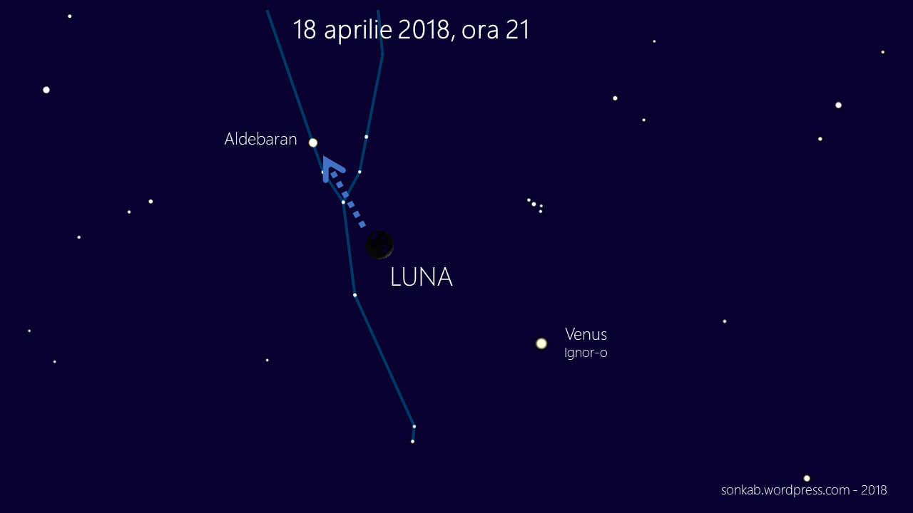 4. De acum vei începe să îți faci prieteni ca orice om normal: seara. Pe primul îl cheamă „Aldebaran” și este ca și ceilalți, o stea. O stea mare, aflată atât de departe încât o vedem cu 68 de ani întârziere. Se va afla deasupra Lunii în seara de 18 aprilie. Luna se va vedea înspre apus, ca o seceră subțire. Cer senin.
