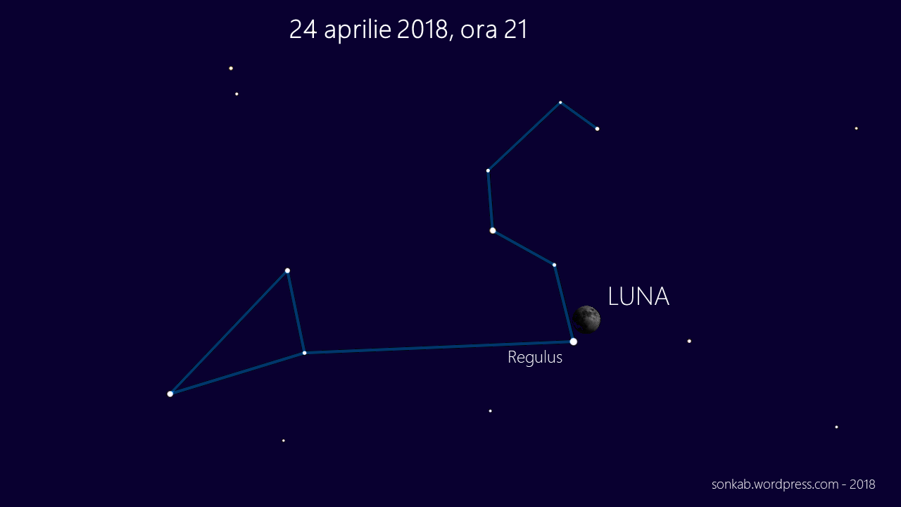 6. În seara de 24 aprilie un alt prieten, stea, se va afla lângă Lună. Caută Luna după ora 21 și vei vedea o stea foarte aproape, la stânga. Steaua se numește „Regulus” adică „micul rege”, un fel de „micul adi minune”. Este și ea o stea triplă, aflată pe la vreo 70 de anișori lumină. O găsești pe cer, în aceeași direcție, fără Lună, dacă privești cerul în următoarele 10 zile la aceeași oră.