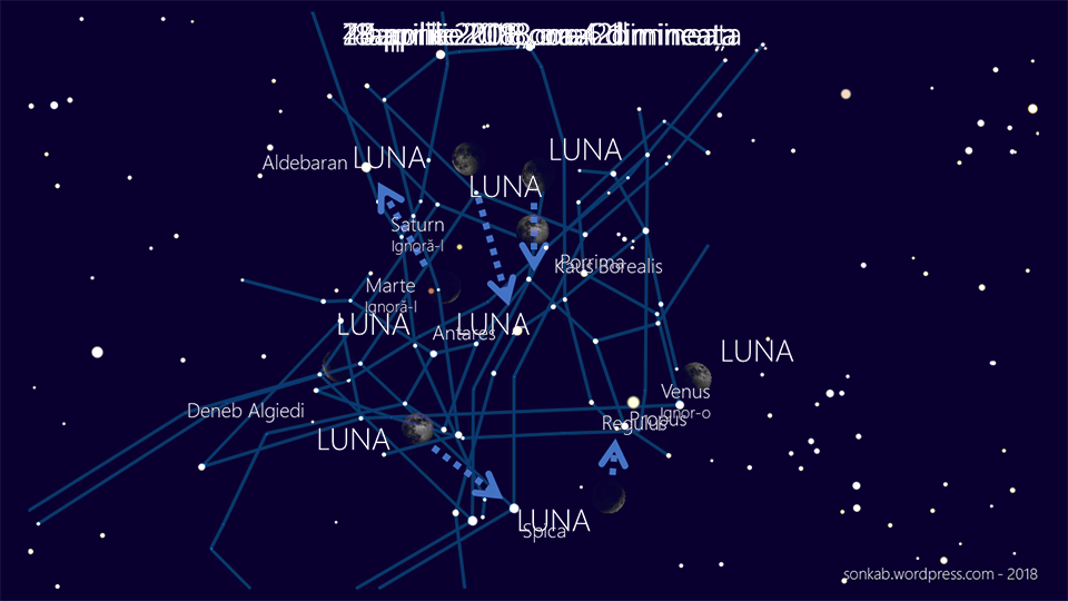 1. Caută Luna în noaptea de 4 spre 5 aprilie, după ora 1 dimineața. O vei găsi înspre est, nu plină dar nici jumate. Se va vedea pănă răsare Soarele și un pic după, dar pe tine te interesează Luna doar pentru că sub ea se vede o stea. Steaua este portocalie și pâlpâie rău de tot. Dacă o vezi, felicitări: ai găsit steaua Antares, o supergigantă roșie aflată la 600 de ani lumină depărtare. Caut-o și în zilele următoare, la aceeași oră, în aceeași direcție.