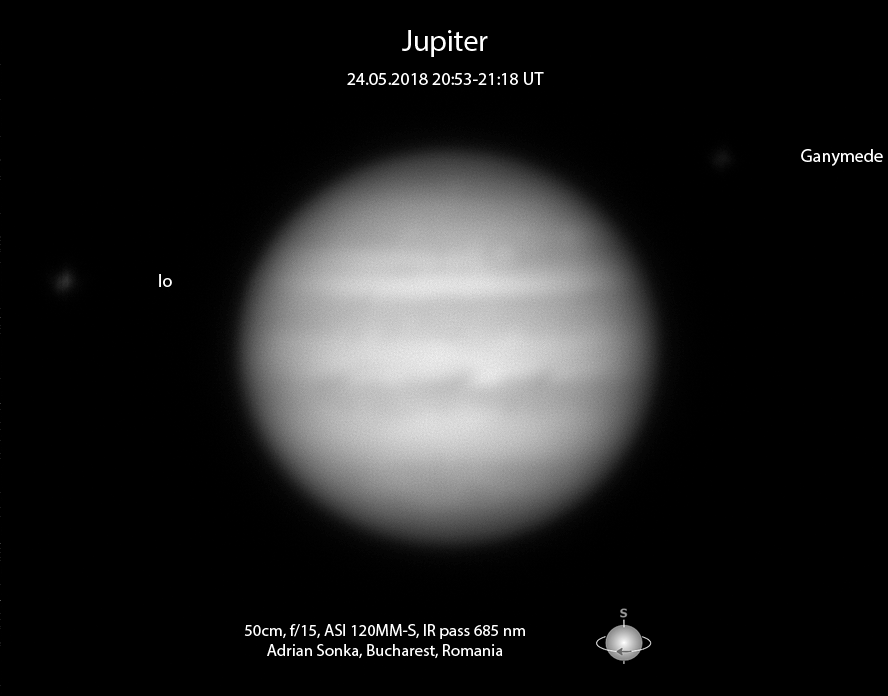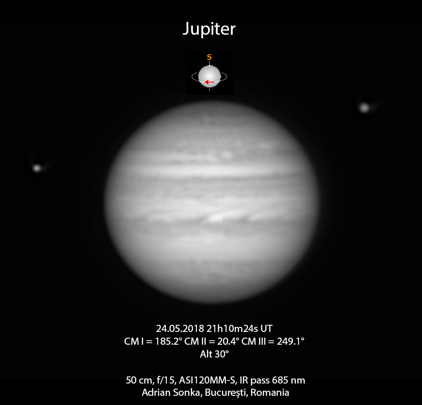Dar nu doar planeta se rotește, ci și sateliții. Priviți-l pe Io cum se apropie de planetă și pe Ganymede cum se îndepărtează. Acum rămâneți cu ochii la Ganymede: veți vedea cum satelitul „apare” din spatele a ceva întunecat. Ceva-ul este umbra lui Jupiter!